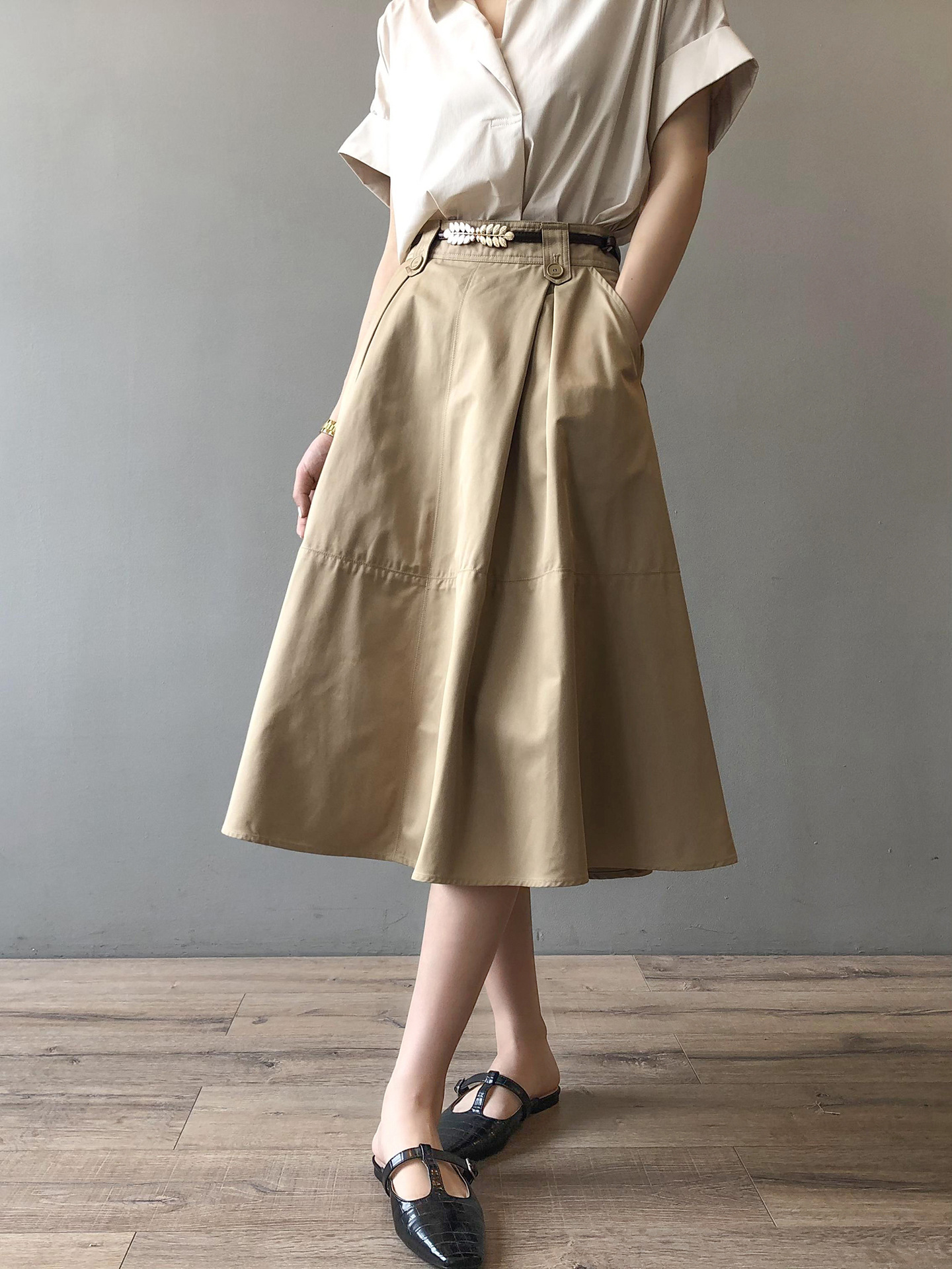 梨形妹子专属伞裙~卡其色通勤百搭半身裙侧口袋宽松中裙 quantity