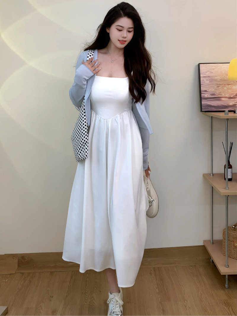 白色吊带裙+灰色开衫