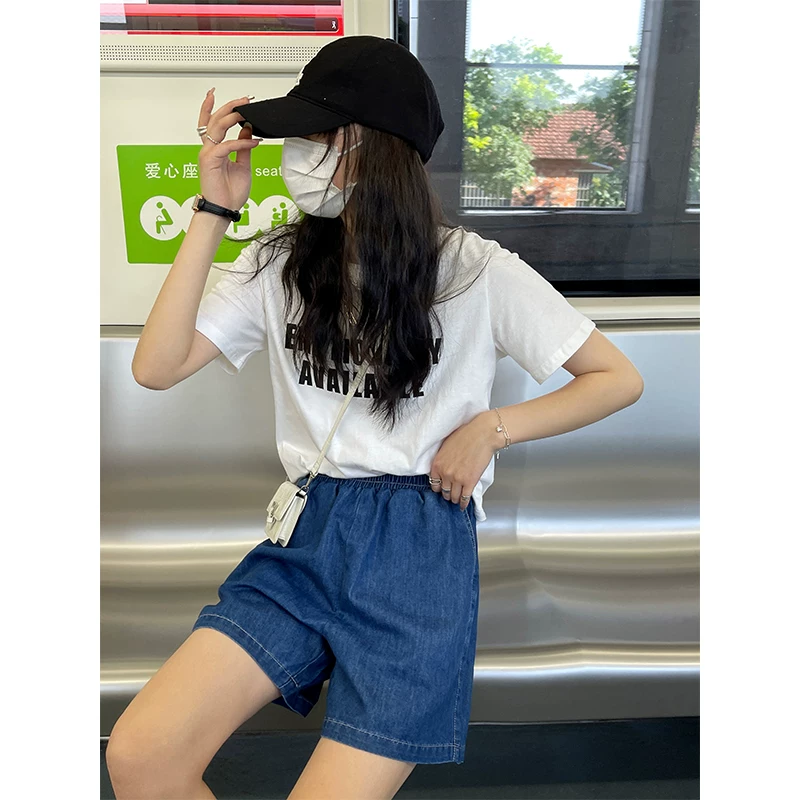 牛仔短裤女高腰宽松百搭松紧腰直筒阔腿短裤