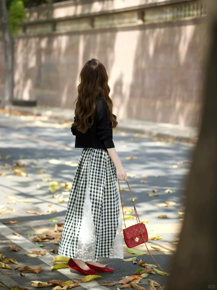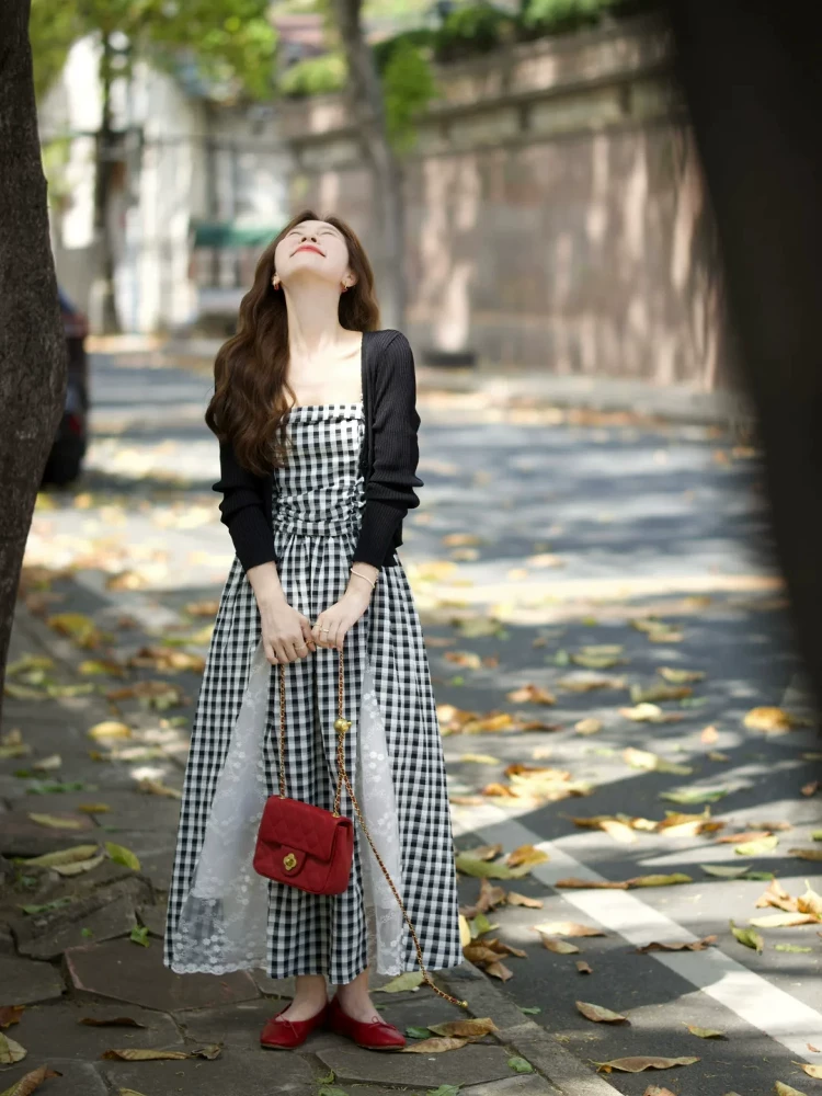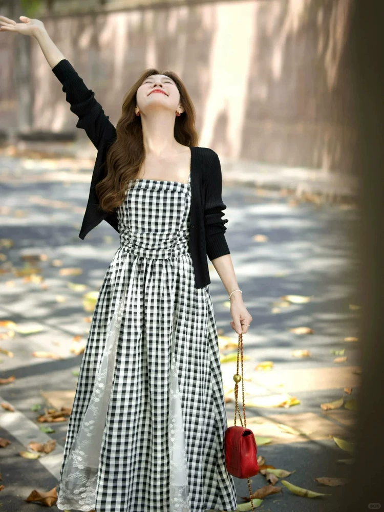 黑色开衫+格子吊带裙